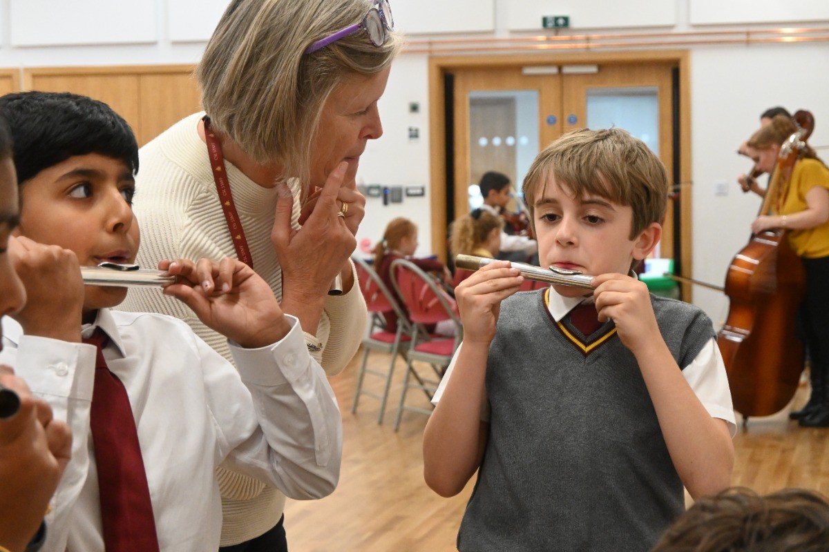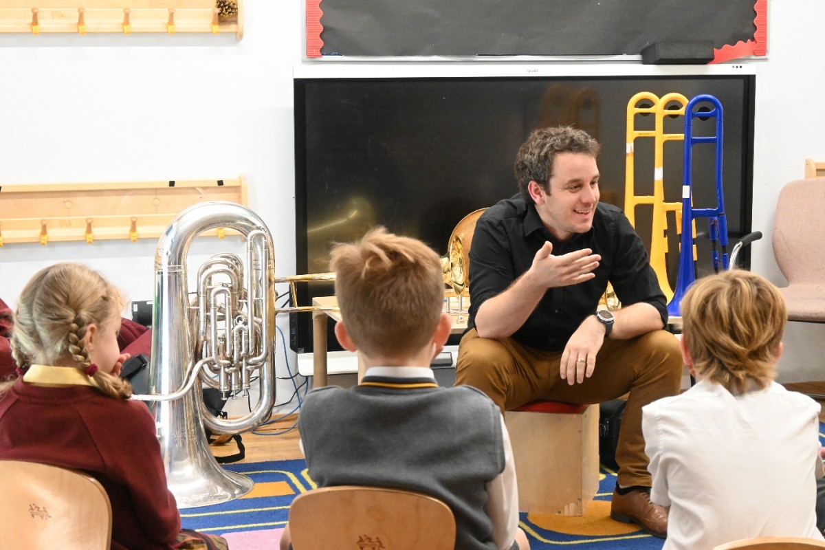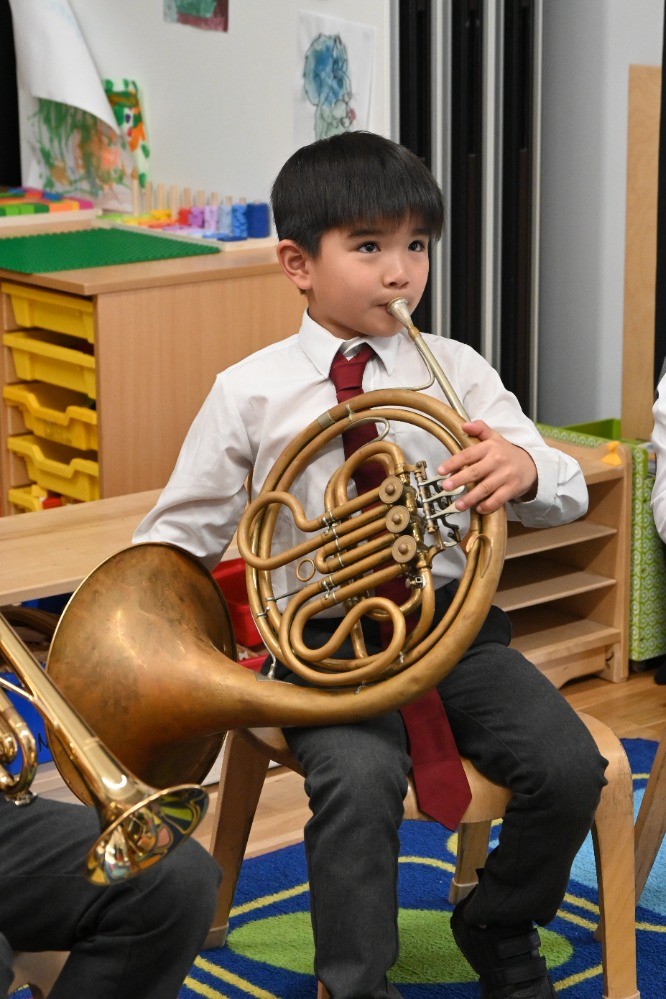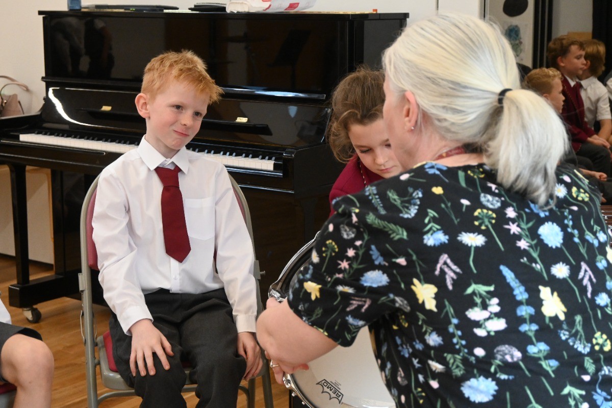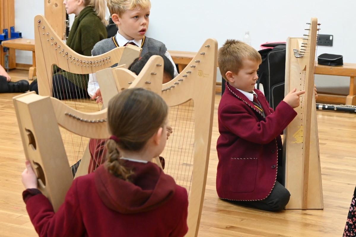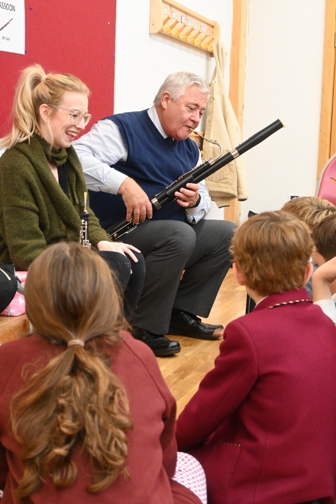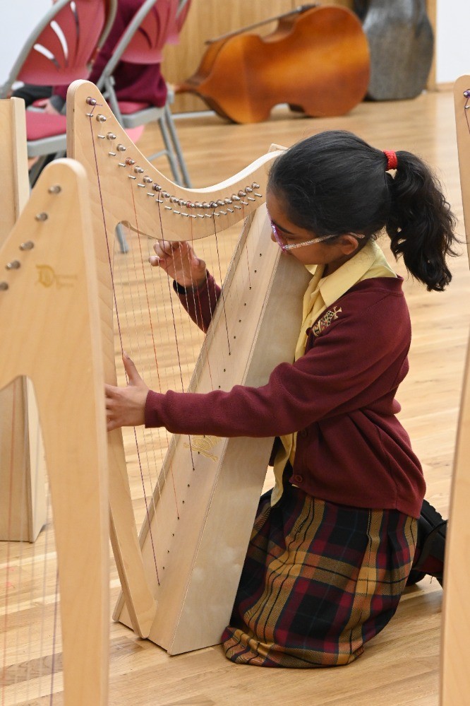 Children had the chance to see and try instruments from across the orchestra, including woodwind (bassoon, oboe, clarinet, flute), brass (French horn, cornet, trombone), percussion, strings (double bass, viola, violin), and even the harp! A particular highlight was a lively teacher performance of the K-pop hit Golden, which had pupils singing along enthusiastically.