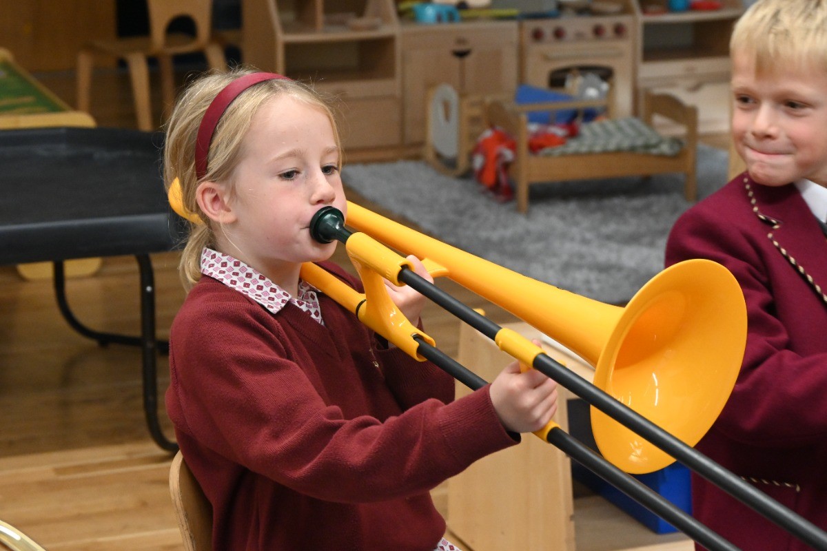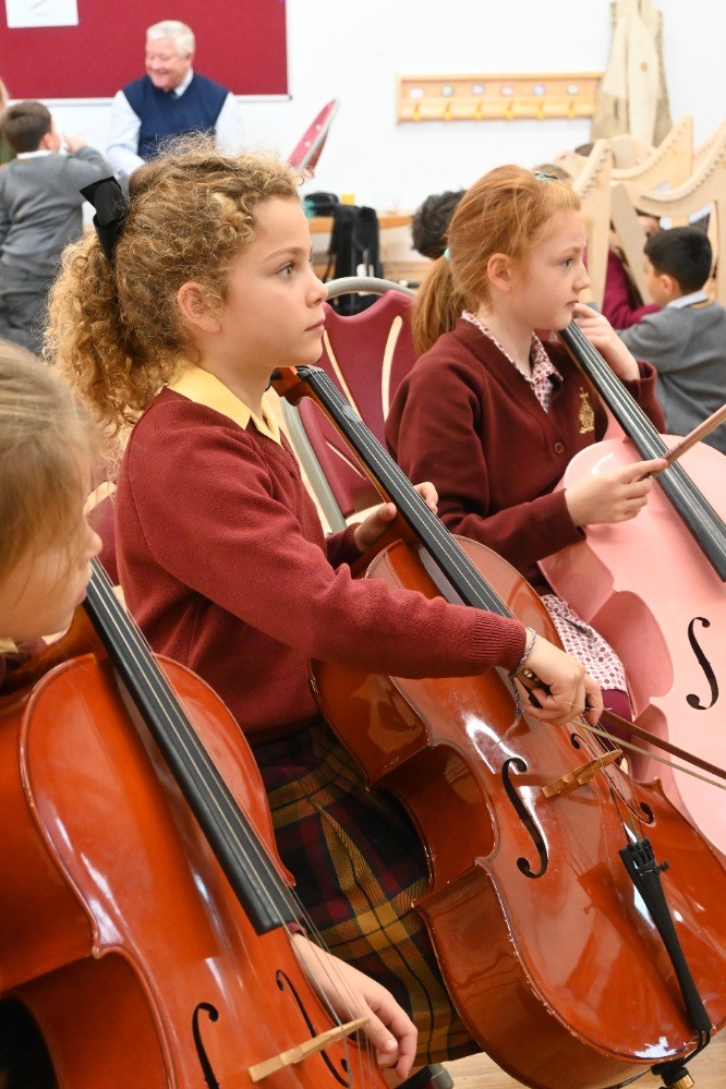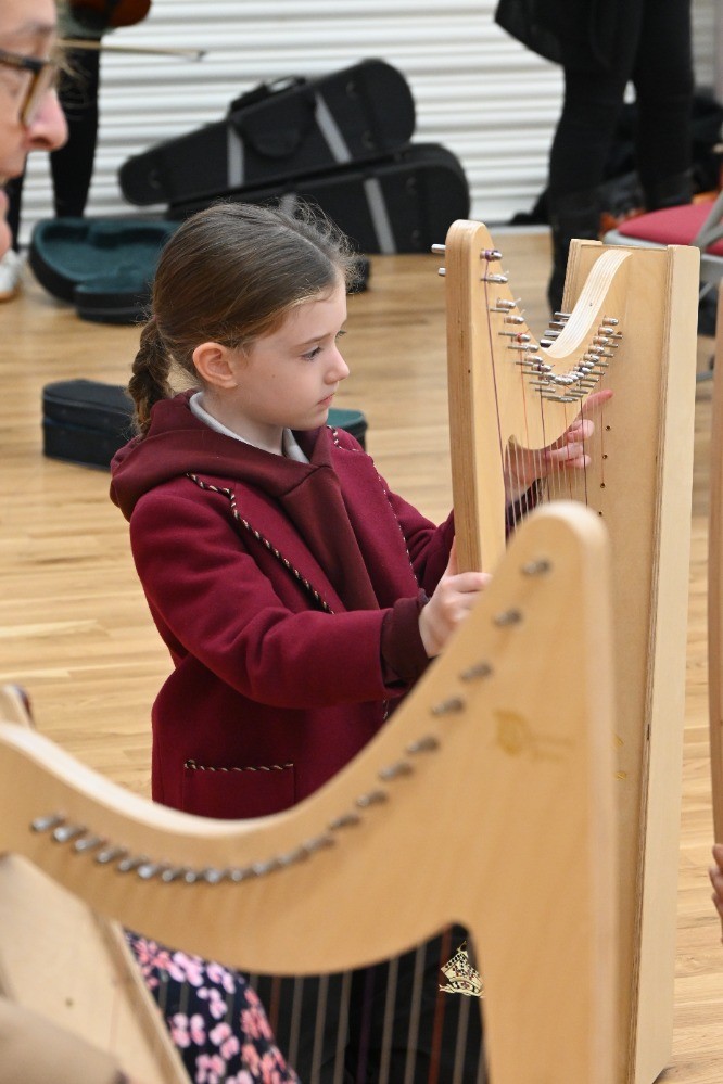 Children had the chance to see and try instruments from across the orchestra, including woodwind (bassoon, oboe, clarinet, flute), brass (French horn, cornet, trombone), percussion, strings (double bass, viola, violin), and even the harp! A particular highlight was a lively teacher performance of the K-pop hit Golden, which had pupils singing along enthusiastically.